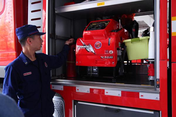 在中队消防战士的带领下,师生还一起参观了消防车,并与车上的消防器材“零距离”接触,聆听了战斗服、液压破拆组器材、无齿锯等消防器材的使用方法,收获满满。音乐系辅导员陈宏为长河中队送上锦旗,致以崇高的敬意。