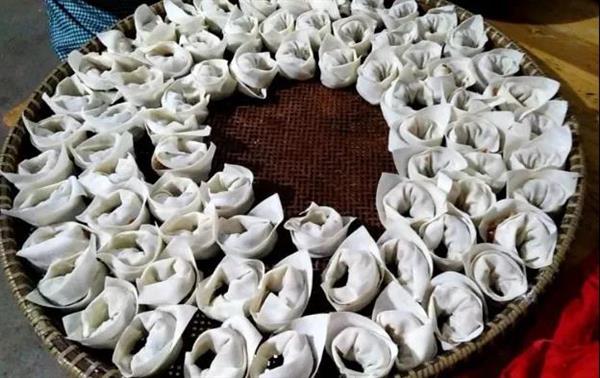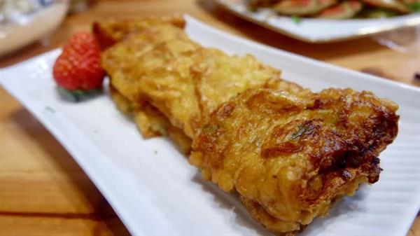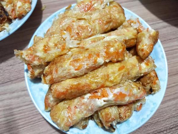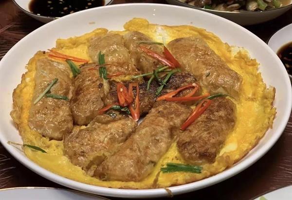 还有一道特色菜是豆腐皮包,豆腐皮包用义乌特产的豆腐皮摊开包上馅料,放进锅里油炸,馅料一般为野菜、萝卜、青菜。豆腐皮色如玉、薄如翼、滑如脂,古代还是朝廷的贡品。今天更是远销全国各地,成为餐桌上一道鲜美的佳肴。