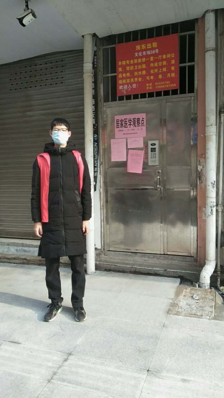 1月20日,钟南山院士在央视证实了新冠肺炎有人传人现象。浙江着手布置相关,把全社会迅速动员起来,严格排摸传染源,阻断潜在的传播途径,对湖北等外地返乡人员进行隔离观察。美术系18广告班龚王鲲就是这时加入志愿者队伍,每天去隔离人员屋外严守,连除夕、正月初一都不例外。从1月22日开始至2月5日,整整14天,风雨无阻。