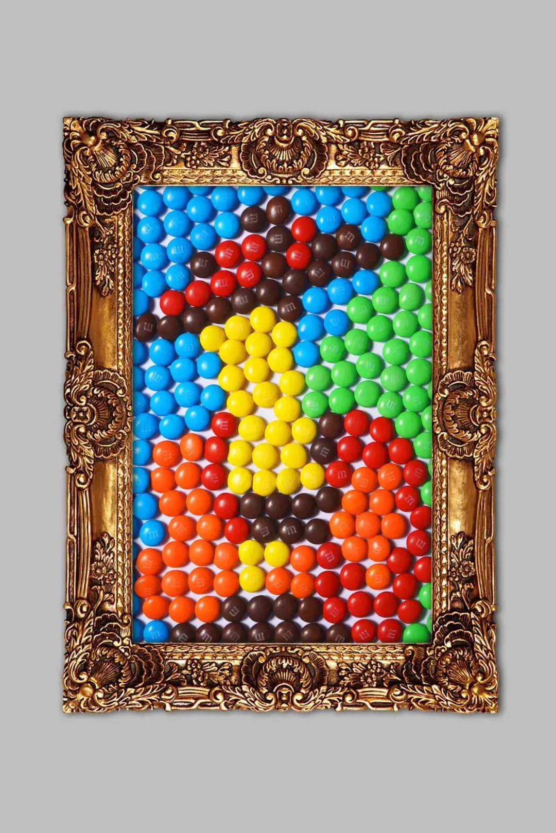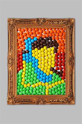 作品阐述:这组作品通过产品颜色重复排列形成名画形象,选用了《梵高自画像》《蒙娜丽莎》《呐喊》《海伦娜·弗尔曼》四幅耳熟能详的名画。用孩子拼图的形式表现产品,一方面体现了产品的多彩性,另一方面也突出了其“只溶在口不溶在手”的广告标语,从而引起消费者的购买欲望。