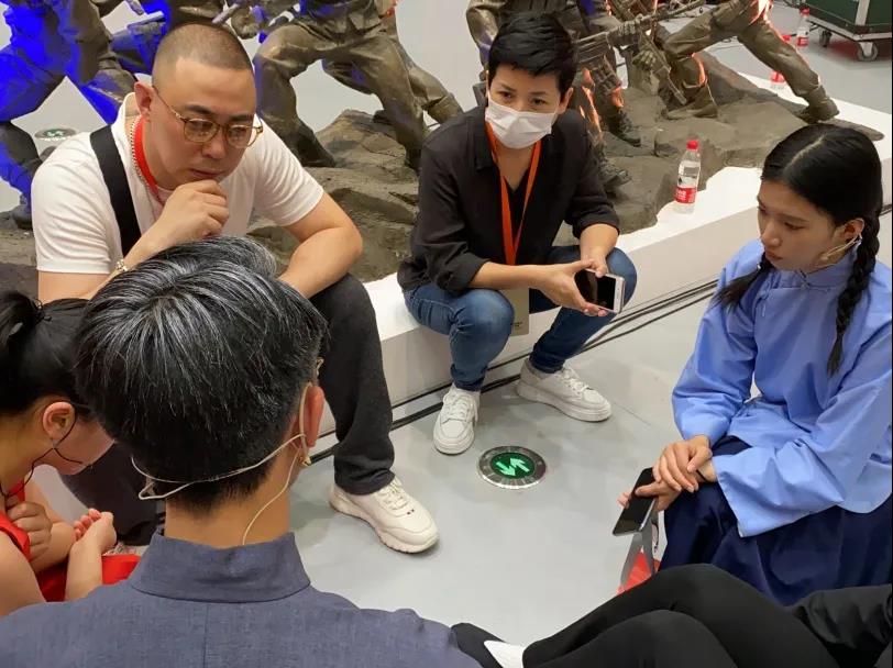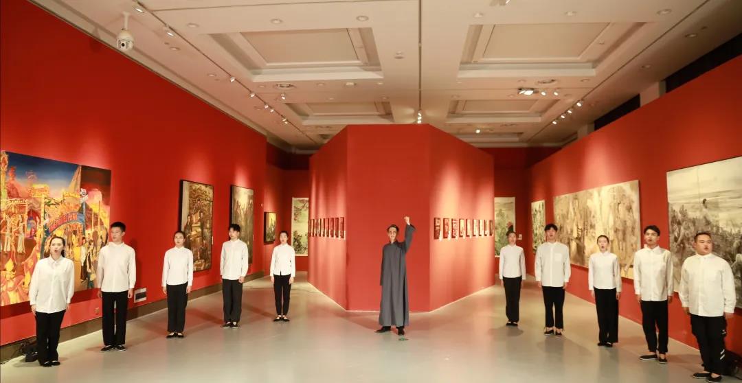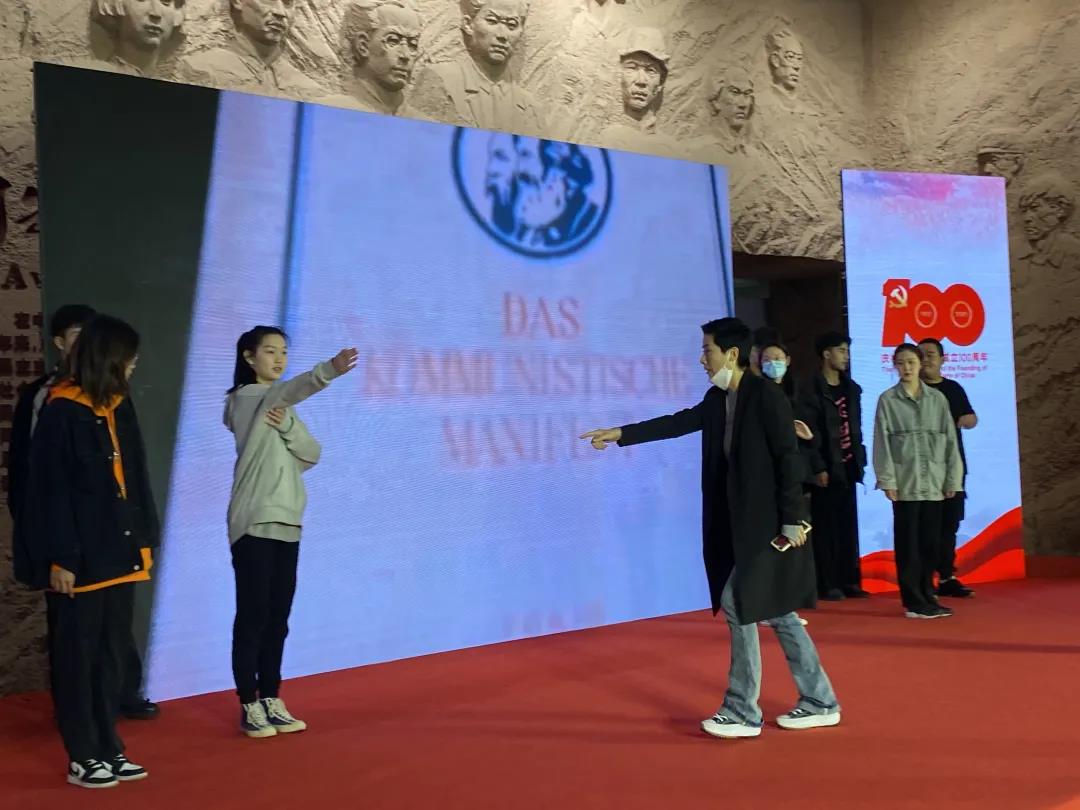 在充满艺术的展览馆里,同学们作为青年代表,以沉浸式表演,立体化呈现了革命先辈陈望道终身为党的事业矢志不渝奋斗的事迹。尽管该作品已经进行过多次排演,但此次将舞蹈元素的融入表演,形成音舞诗画的演出形式,内容更加丰富,更具观赏性。在戏剧系副主任(主持工作)那刚,专任教师姚红的带领下,同学们在现场进行重新创排。整整一个下午连续排练,一次次大胆创新,创排出6种版本,一次比一次精炼,呈现效果也越来越精彩。虽然同学们非常疲惫,但是当看见老师在舞台上热情饱满的悉心指导,还有优秀舞蹈艺术家与大家一次次的舞蹈配合。他优美的舞姿,柔软的身段,不禁让同学们折服,大家感受到了艺术与艺术的碰撞。