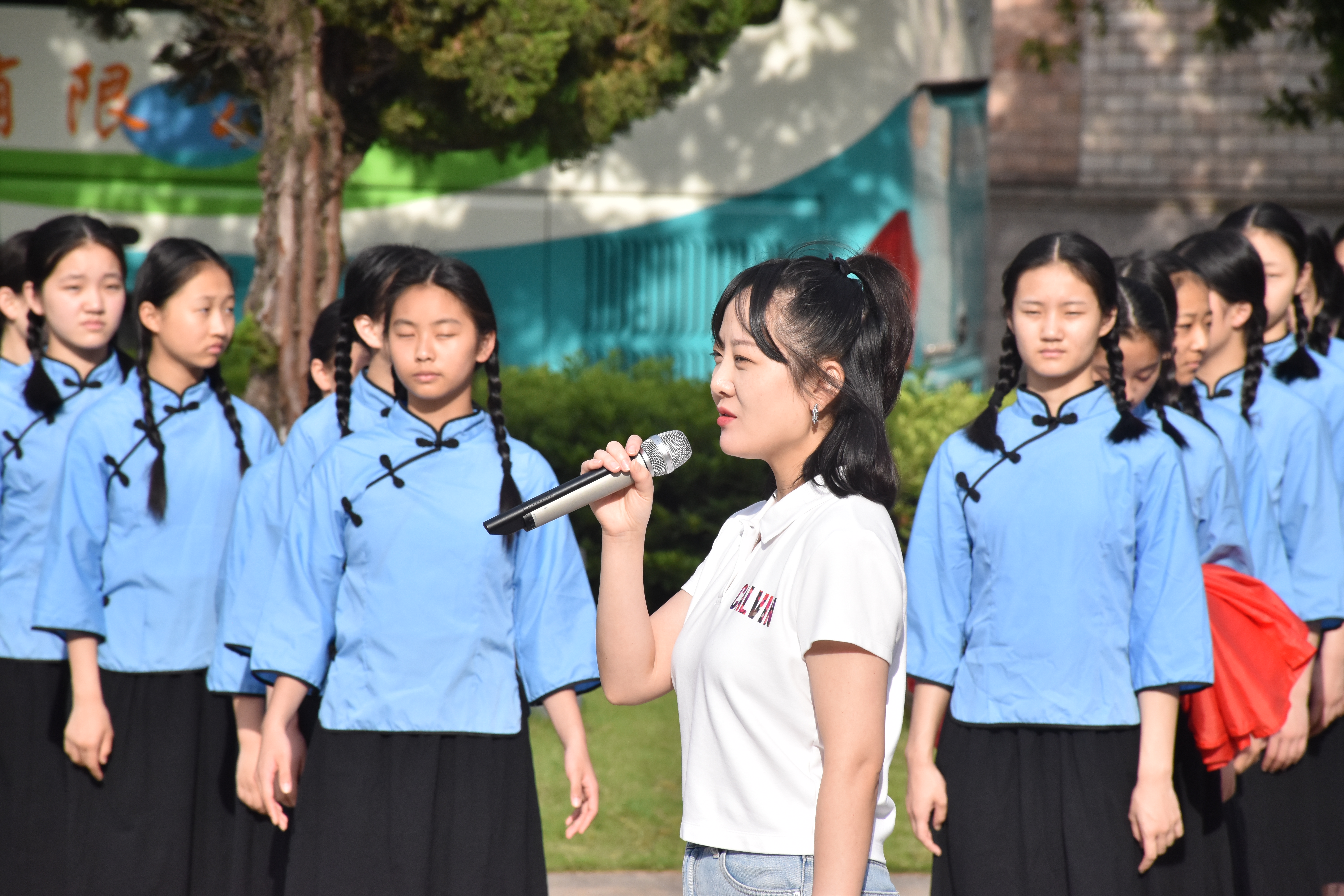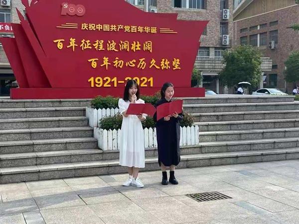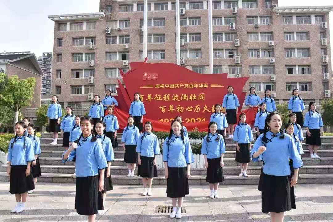 紧接着,朗朗诵读声中,2019级小百花班全体女生身着蓝色学生服,以戏曲人独有的方式,声情并茂地演绎了越剧版《唱支山歌给党听》,优美婉转的歌声在清晨校园中回荡。台上,鲜艳的党旗迎着朝阳徐徐展开,台下,师生们挥舞着手中的红星。就这样,鲜红的党旗、鲜艳的国旗、殷红的红星在朝阳之下熠熠生辉、交相呼应。